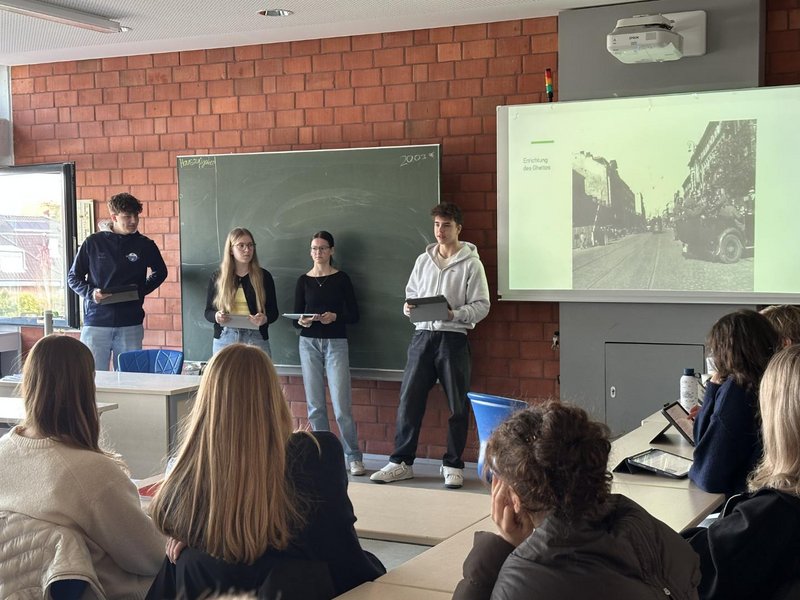 Was wissen wir über Jüdinnen und Juden, die von Paderborn nach Warschau deportiert wurden? Wie sah der Alltag im Warschauer Ghetto aus? Was kennzeichnete den Warschauer Ghetto-Aufstand 1943 und warum ist er bis heute so wichtig? Diesen Fragen gingen am Wochenende 26 EF-Schüler:innen nach, um sich auf die Gedenkstättenfahrt nach Warschau und zu den vergessenen Orten der Shoah in Ostpolen vorzubereiten.